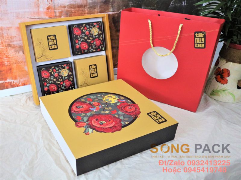 Hộp Bánh Trung Thu mẫu Hoa Đất được thiết kế và sản xuất để đựng 4 bánh từ 200gr đến 250gr với chi tiết như sau:
